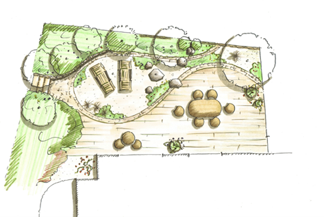 Gemeinsam legen wir dann die Hauptformen fest. Dabei werden auch Farben, Solitärpflanzen (Hausbaum, einzeln stehende Pflanzen), Mauern, Terrassen, Sitzplätze oder Teiche geplant.